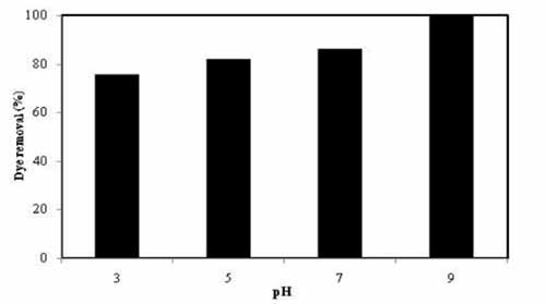 圖2:pH對活性炭吸附甲基紫的影響(條件:初始濃度=100mg L-1,接觸時間=120 min,活性炭劑量=0.6g L-1)。