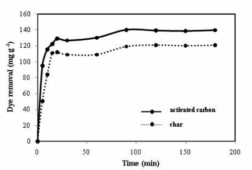 圖3:接觸時間對活性炭吸附甲基紫的影響(條件:初始濃度=100mg L-1,pH=9,活性炭劑量=0.6g L-1)。