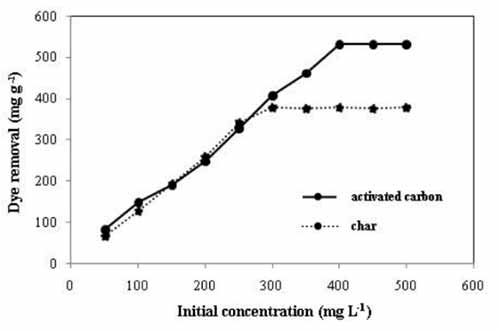 圖4:初始濃度對活性炭吸附甲基紫影響(條件:pH=9,接觸時間=90分鐘,活性炭劑量=0.6g L-1)。