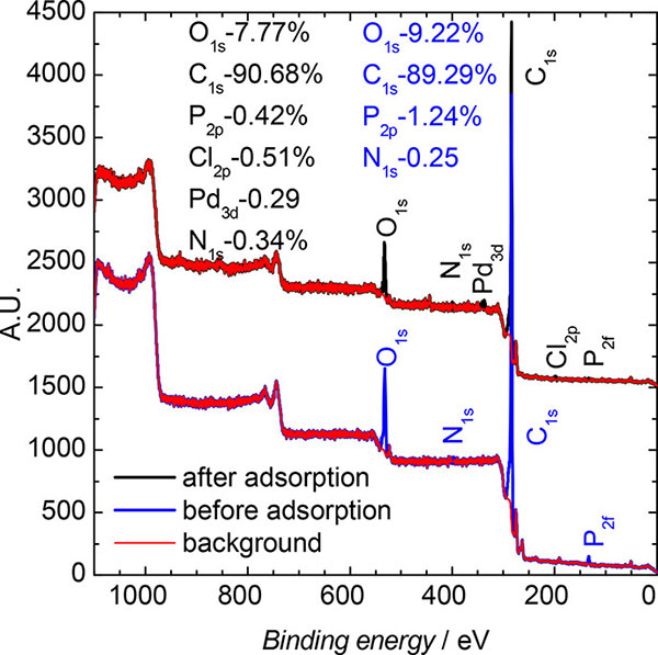 吸附過程之前和之后材料的完整XPS光譜如圖2所示。考慮到觀察到的溶液中Pd(II)濃度的降低,估計鈀負載等于0.7%(m/m)。可以看出來自鈀的峰出現。對這個峰值進行更深入的分析可以為我們提供有關鈀電子結構的信息。
