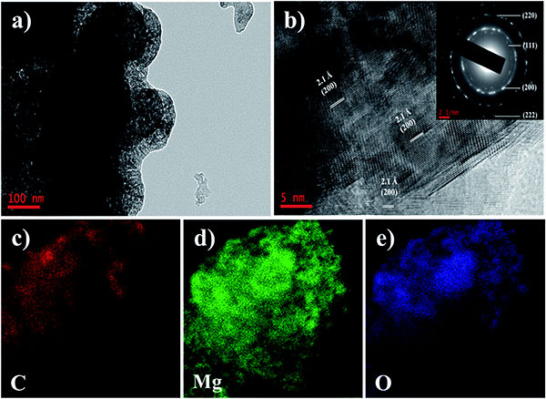 為了進一步揭示改性活性炭的微觀結構,我們進行了TEM,選擇區域電子衍射(SAED)和能量色散譜(EDS)測量。由于所有樣品具有相似的形態,因此選擇活性炭中氧化鎂含量10%的樣品作為典型實例。TEM圖像(參見圖2a)顯示樣品由許多小的氧化鎂納米晶體和碳基質組成。圖2b顯示改性活性炭的HR-TEM圖像。層間距為2.1的氧化鎂晶格條紋歸因于立方氧化鎂的(200)晶格面。相應樣品的SAED圖案(圖2b的插圖)顯示明亮的圓圈環,表明所選區域中氧化鎂的多晶性質。分配給氧化鎂的(111),(200),(220)和(222)反射的衍射同心環是明顯的,并且結果與從XRD數據獲得的氧化鎂平面一致。如圖2c-e所示,EDS映射結果表明鎂和氧元素均勻分布在活性炭表面而不是明顯的聚集。