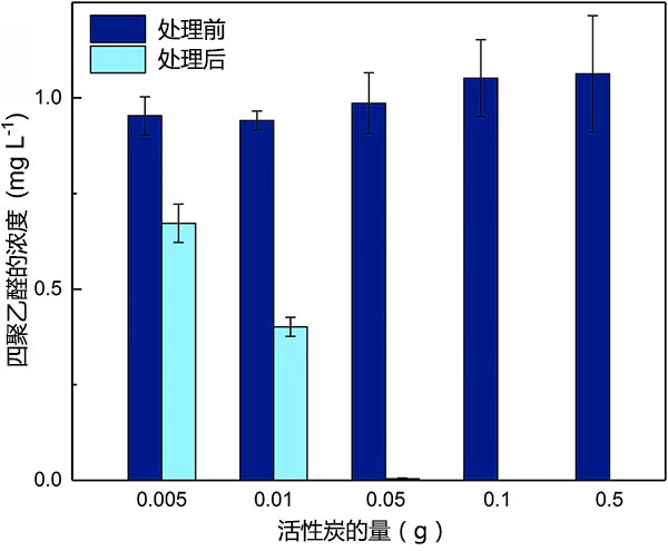 圖2顯示了在不調節(jié)單一體系中的聚乙醛溶液的pH的情況下處理前后的四聚乙醛濃度?梢钥闯,有效地除去了聚乙醛,特別是在活性炭劑量較高的情況下。單因素統(tǒng)計檢驗證實,在活性炭處理2小時之前和之后,乙醛濃度之間存在顯著差異(p<0.05)。當活性炭用量從0.005g增加到0.05g時,去除甲醛的百分比從30.3%增加到99.6%。當PAC用量高于0.05 g時,處理后未檢測到乙醛,表明其濃度低于檢測到的聚乙醛(1~5μgL-1)。