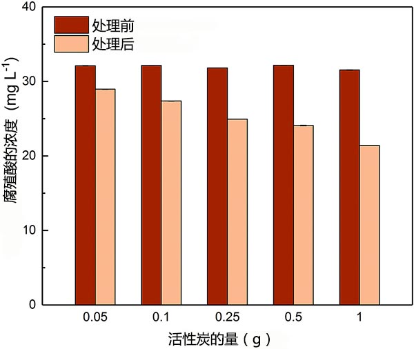 圖3顯示了不同劑量的活性炭處理之前和之后的HA濃度。通過在活性炭上吸附適度除去HA。隨著活性炭劑量的增加,HA的去除百分比范圍為9.8%至32%。雖然處理前HA的初始濃度(C 0=30 mg L-1)遠高于聚乙醛(C 0=1 mg L-1),但高劑量的活性炭(例如1g)在2小時內也只能去除32%的HA。