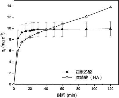 圖4:在單吸附系統(tǒng)中2小時內PAC對聚乙醛和HA的吸附比較。