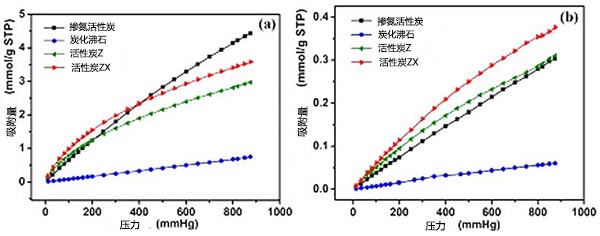 圖3、幾種活性炭樣品上的氣體的實驗吸附等溫線,(a)CO 2,(b)N 2。