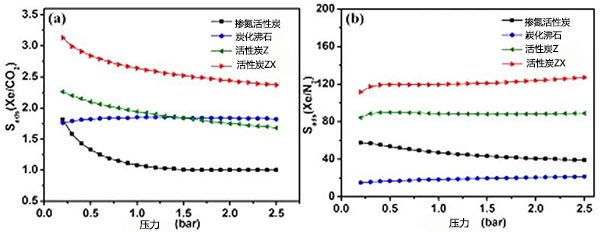 圖4、幾種活性炭樣品吸附選擇性分別為(a)Xe/CO 2,(b)Xe/N 2,摩爾分數y CO2=0.99,y N2=0.99。