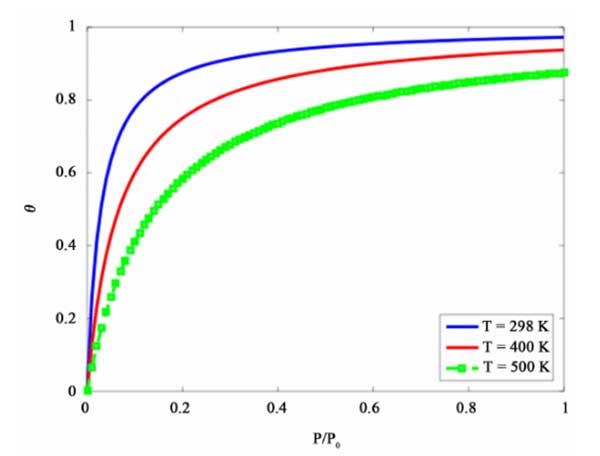 下圖(圖1)顯示了加載分數θ與氣體壓力P/P0在不同溫度之間的定量關系。BET方程是模擬活性炭上氣體吸附動力學的好方法,但它僅適用用于單組分氣體吸附。在下面的部分中,介紹了多組分油蒸氣回收的綜合模型。