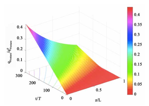 圖5:填充床反應器中戊烷在活性炭吸附劑上的載荷的時空分布。