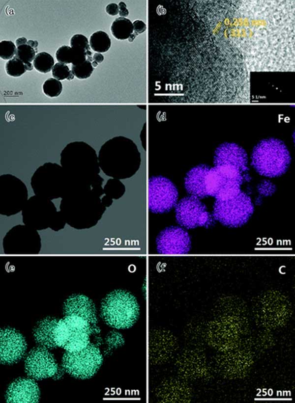 活性炭復合物的TEM圖像和相應的元素分布示于圖5中。如圖,所制備的活性炭均接近球形,粒徑主要集中在約250nm。從圖3(b)中的HR-TEM圖像可以清楚地觀察到單個Fe 3 O 4納米顆粒的良好晶粒取向,并且該區域中的SAED圖案也顯示出Fe 3 O 4的結晶特征。如圖3(c-f)所示,其中可以清楚地觀察到復合材料由Fe,O和C元素。C的分布區域明顯大于Fe和O的相應區域,表明鐵納米顆粒分布在活性炭的表面上。因此,結合XRD,VSM和SEM結果,我們可以得出結論,Fe 3 O 4 納米顆粒緊密粘附在活性炭的表面上。