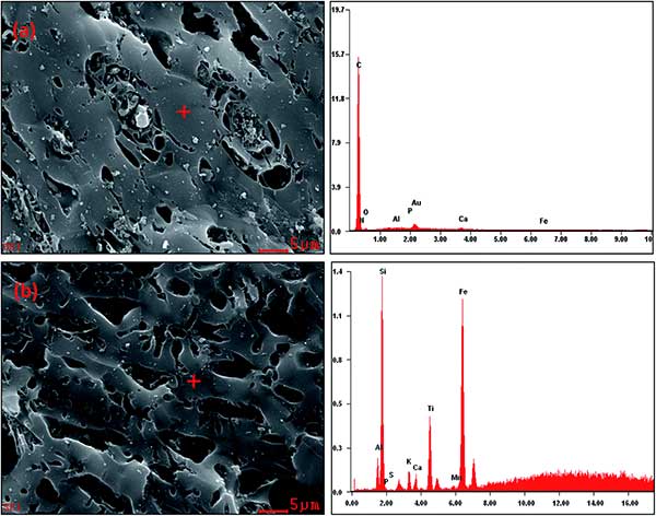 圖1:SEM圖像和活性炭(a)和鐵改性活性炭(b)的相應EDS光譜。
