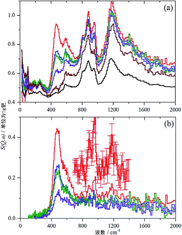對于活性炭樣品中的每一個,氫氣在飽和壓力(700毫巴)下記錄IINS光譜,然后逐漸使每個活性炭脫氫,首先使其在室溫下脫氣不同時間并且然后在200°C下放置12小時。圖2顯示了標準化光譜活性炭和活性炭負載鈀的差異光譜,(a)記錄的標準化光譜,氫氣從上到下在700毫巴下,抽真空至9毫巴,抽空至3毫巴,在200℃下抽真空放置12小時,在200℃下第二次抽真空后放置12小時的活性炭。(b)減去在200℃下第二次抽空過夜的樣品后的差異光譜,從上到下:氫氣在700毫巴下,抽真空至9毫巴,抽真空至3毫巴,在200℃抽真空放置12小時后的活性炭負載鈀催化劑。