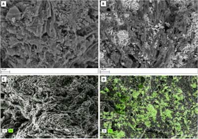 圖1:(A)活性炭和(B)摻雜磁鐵礦的活性炭的SEM圖像(C)活性炭和(D)磁鐵礦摻雜活性炭的元素映射的SEM-EDS圖像。