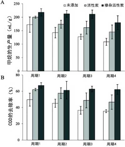 圖2:(A)四個連續活性炭補料分批循環中的平均特定甲烷產量和(B)COD去除效率。