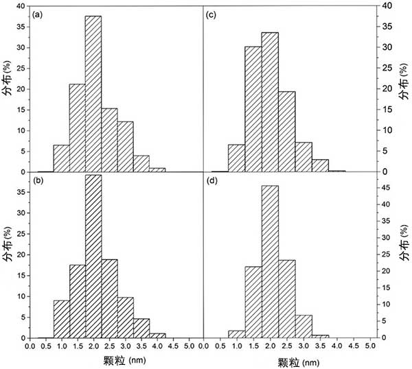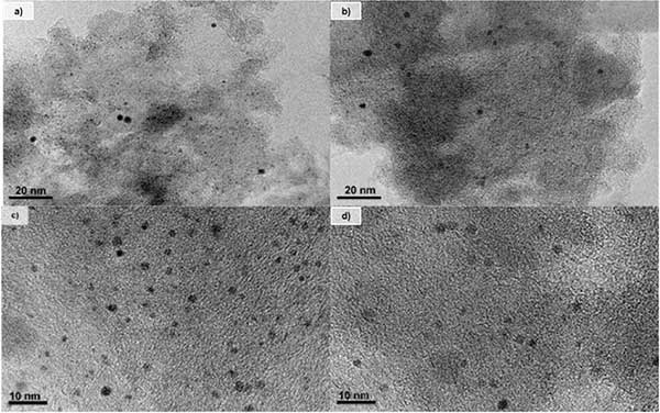 所有活性炭催化劑都顯示出高BET表面積。在二氯甲烷加氫脫氯中使用后沒有觀察到顯著差異,這消除了碳質沉積物阻塞多孔結構作為催化劑失活的原因。CO化學吸附結果表明,鉑在所有活性炭催化劑中均勻分散,它們之間略有不同。高Pt分散可歸因于活性炭的高表面積及其表面化學性質,這在催化劑制備過程中引起活性相與載體之間的相互作用。TEM圖像(圖1)和金屬粒度分布(圖2)證實了在鉑在兩種不同活性炭中形成Pt納米顆粒,平均尺寸值分別為1.6和2.0nm。