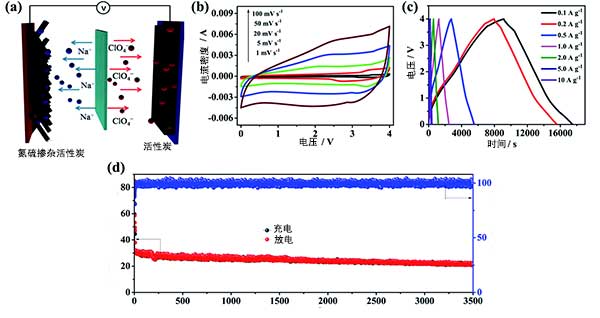 如圖3a所示,使用氮硫共摻雜活性炭作為陽(yáng)極并且商業(yè)活性炭作為陰極在電解質(zhì)溶液中構(gòu)建的鈉離子電容器裝置。在充電過程中,ClO 4-離子在活性炭的多孔結(jié)構(gòu)中被吸收,而來自電解質(zhì)的Na離子被插入到氮硫共摻雜活性炭中。放電過程與充電過程相反。在制造鈉離子電容器之前,氮硫共摻雜活性炭電極在預(yù)活化10個(gè)循環(huán)在Na離子半電池中獲得高效率,然后放電至0.01V的截止電壓。此外,研究了活性炭作為陰極的電化學(xué)性能,以評(píng)估陰極和陽(yáng)極之間的電荷平衡。活性炭的比表面積高達(dá)1500以上。根據(jù)活性炭陰極和氮硫共摻雜活性炭陽(yáng)極的比容量值,鈉離子電容器中氮與硫摻雜活性炭的質(zhì)量比為3:1。