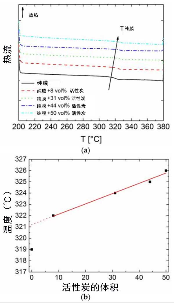 圖1:原始膜和加入活性炭后的混合基質構件(a)活性炭體積含量的函數的玻璃化轉變(b)。