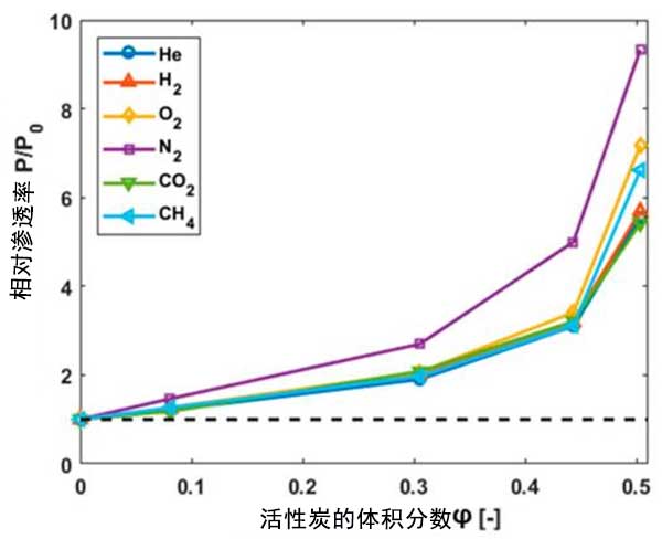 圖2:活性炭膜的滲透率與聚合物膜的滲透率之比作為活性炭體積分數的函數。