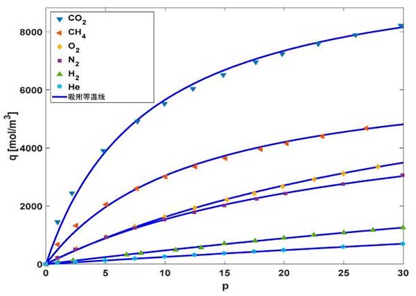 圖3:活性炭在不同氣體在壓力下的濃度和在30℃下的相應吸附等溫線。