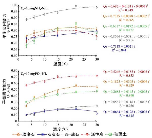 銨和磷酸根離子的平衡試驗(yàn)僅在3℃至22℃的溫度范圍內(nèi)進(jìn)行,因此,吸附容量和溫度的關(guān)系沒有用多項(xiàng)式函數(shù)描述。類似地,如在系列I的分析中,活性炭對(duì)除去銨離子效果比較好,在磷酸鹽的情況下,具有高去除能力的材料是活性炭。