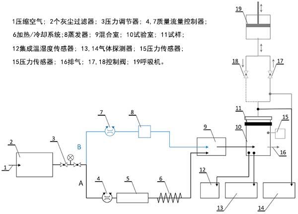 使用環(huán)己烷蒸氣作為被吸附物質(zhì)在圖2中所示的試驗(yàn)臺上進(jìn)行突破性實(shí)驗(yàn)。選擇環(huán)己烷進(jìn)行實(shí)驗(yàn),因?yàn)樗菧y試標(biāo)準(zhǔn)中特性比較全面的。此外,測試設(shè)置如圖2所示由于這種情況,優(yōu)化了使用環(huán)己烷作為測試物質(zhì)。環(huán)己烷是這類物質(zhì)的良好代表,因?yàn)樗欠菢O性和非反應(yīng)性的,因此應(yīng)主要通過物理吸附與活性炭表面結(jié)合。此外,它是在工業(yè)過程中大量使用的化合物之一,因此它經(jīng)常存在于工作環(huán)境中。