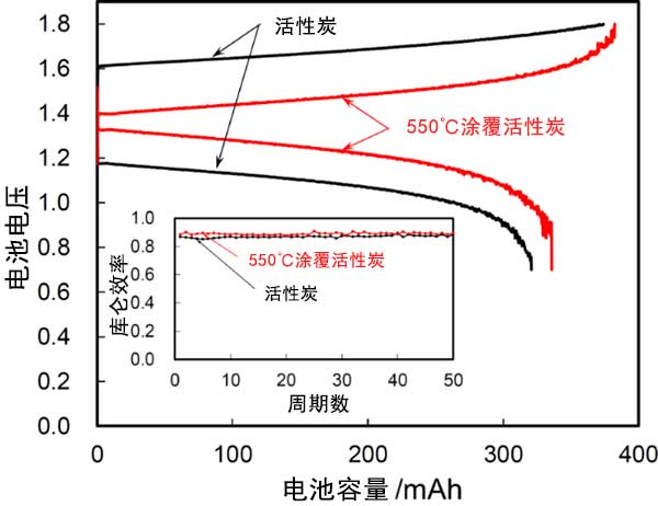 圖4:使用活性炭和錫酞菁涂覆活性炭作為電極的流通池的充放電曲線和循環性能。
