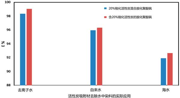 圖3:胺化聚醚砜和20%羧化活性炭對不同實際樣品中酸性紅的吸附百分比。