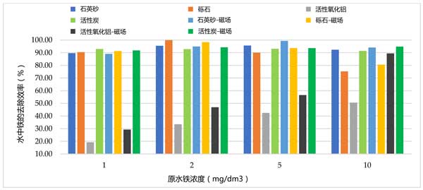 從水中除去鐵和錳可以通過許多常規方法進行。通常,除鐵的本質是Fe(II)離子氧化成Fe(III)并通過沉降和過濾從處理過的水中除去沉淀的Fe(OH)3沉積物。然而,脫錳包括將Mn(II)離子氧化成Mn(IV)和以MnO 2沉積物形式沉淀。用于從水中除去這些金屬的方法由它們在處理過的水中發生的形式決定。我們在水過濾和從水中去除鐵和錳的實驗方面有經驗,并且已經開展了一種新工藝的研究,該工藝可以通過傳統方法提高鐵和錳的去除效率。因此,進行測試以確定磁場對活性炭的過濾過程的影響。水磁化實驗的目標不是鐵還是錳氧化,影響的是水分子的排序。首先測試活性炭和其他吸附劑單獨對樣品水的過濾情況,發現僅在通過活性炭過濾的樣品的情況下,樣品中的鐵濃度至磁化低于對照樣品。在該床中除鐵的計算效率在對照樣品中約為83%,在磁化樣品中為93%(圖2)。在活性炭過濾過程中,鐵去除效率的差異計算為約3%,有利于用磁化處理的樣品。