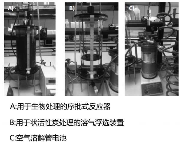 污水處理廠的活性污泥用于承載微生物,收集活性污泥并對(duì)其主要參數(shù)進(jìn)行表征銨,硝酸鹽,亞硝酸鹽,磷酸鹽,化學(xué)需氧量,生物需氧量,總懸浮固體和pH每周一次,并儲(chǔ)存在4°C直至使用。將5L活性污泥泵入生物處理的序批式反應(yīng)器,混合并充氣2小時(shí),然后使污泥靜置30分鐘。將1.7L上清液轉(zhuǎn)移至活性炭處理的溶氣浮選裝置單元,其中加入粉末狀活性炭并混合(30分鐘)。下一步包括加入凝結(jié)劑聚氯化鋁,12分鐘后加入絮凝劑。最后,將飽和水注入活性炭處理的溶氣浮選裝置裝置,開始分離步驟(12分鐘)。整個(gè)過程持續(xù)了大約四個(gè)小時(shí)。