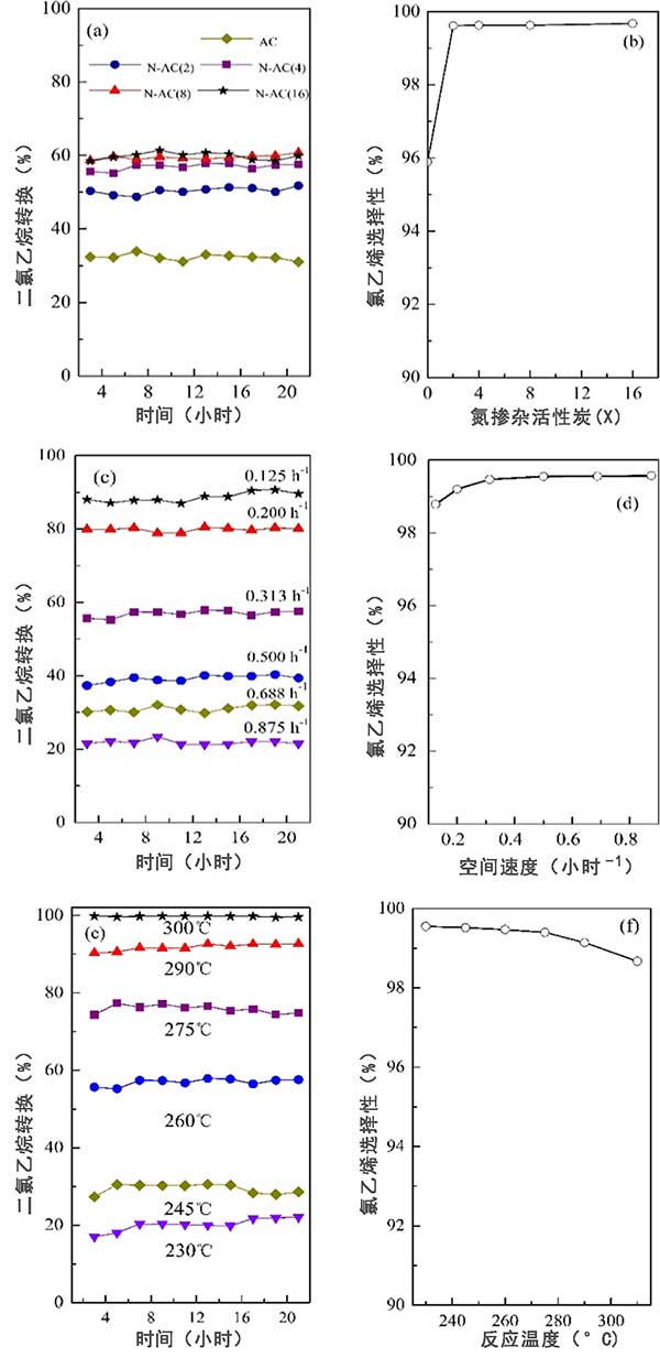 b、顯示出了反應溫度對氮摻雜活性炭中的二氯乙烷液時空速穩定性的影響。氯乙烯選擇性在所有情況下都是相對靜態的,高于99%。