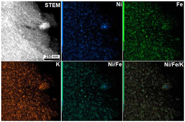 圖2:活性炭負載過渡金屬鎳材料的EDX圖譜,顯示了納米粒子中鎳,鐵和鉀的存在。