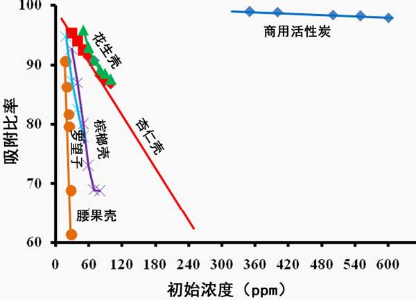 在不同的初始濃度下,對(杏仁殼,花生殼,檳榔殼,羅望子殼和腰果殼)活性炭和活性炭上的天青A染料去除程度進行分批吸附研究,在固定劑量,在室溫(30 ± 1 °C)下接觸時間為30分鐘。隨著初始濃度的增加,所有活性炭上染料的去除率趨于降低(圖1)。這可能是由于缺乏高初始濃度的天青A所需的可用活性位點所致。在較低濃度的天青A大量吸附了留下更多數量的活性部位的吸附劑,在較高濃度較小數量的活性位點仍然可用。