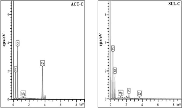 各種尺寸的活性炭和磺化炭的SEM圖像形態(tài)如圖1所示。。ACT-C和SUL-C催化劑的SEM圖像表明,白點(diǎn)代表無(wú)機(jī)成分。從圖像可以看出,活性炭具有不規(guī)則的致密結(jié)構(gòu),而顆粒看起來(lái)像具有光滑表面的顆粒。圖2顯示了ACT-C和SUL-C催化劑的EDX圖,并觀察到SUL-C圖中存在硫。此外,在ACT-C和SUL-C的圖中,還有一些額外的峰涉及雜質(zhì),因?yàn)樘荚词菑U物生物質(zhì),因此可能存在這些雜質(zhì)。如圖3所示,通過(guò)TEM分析了活性炭和磺化炭的形態(tài)和結(jié)構(gòu)。該TEM圖像ACT-C催化劑的“A”表示僅存在微孔,而SULC催化劑則顯示了“微孔”和“中孔”,這是由于活性炭材料上的磺化作用所致,在活性炭材料中產(chǎn)生了中孔。