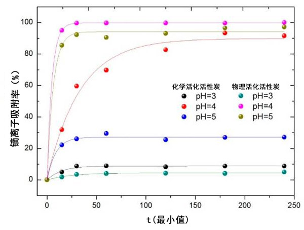 我們系統的研究了三種不同參數對兩種類型的活性炭吸附能力的影響:溶液的pH值,鏑離子濃度和活性炭量。