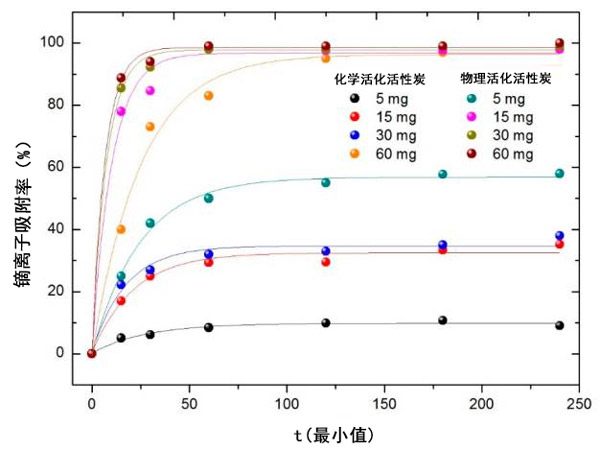 活性炭量的影響:最后,研究了活性炭吸附量的影響。將濃度為5 mg·L -1的鏑溶液與不同量的兩種活性炭(5、15、30和60 mg)接觸。結果繪制在圖5中。