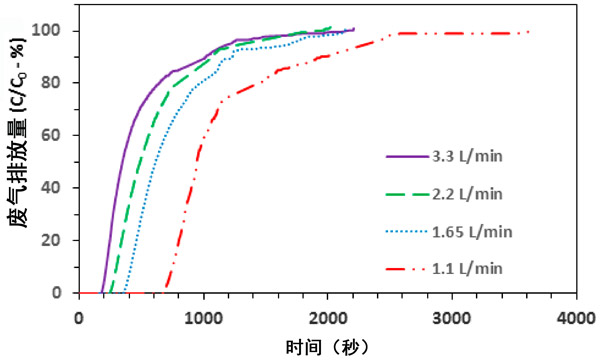 本研究還使用基于數據坑的活性炭研究了氣體流速對氨吸附的影響。圖3提供了1.1至3.3 L/min的氣體流速的相應結果。通常,氨氣流量的逐漸增加也會導致相應的穿透時間和排氣時間響應逐漸減少(圖3)。例如,流量為1.1、1.65、2.2和3.3 L/min時的突破時間分別為712、383、272和197 min(圖3)。因此,較高的突破時間值在較低的氨氣流速下蒸發。此外,對于1.1、1.65、2.2和3.3 L/min流量研究,還分別記錄了2312、1673、1315和1213分鐘的排氣時間。這類似于上述突破時間趨勢,可以解釋如下。在較低的流入氣體流速下,氨分子從氣相到活性炭表面的傳質速率也相對較小。因此,與較高氣體流速下的活性炭表面部位相比,單位時間內所占據的活性炭表面部位也更少,產生更高的穿透時間和耗竭時間響應(圖3)。這些發現對于實際應用尤其重要。