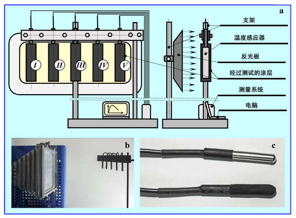 圖1:用紅外輻射測量被測涂層的加熱和冷卻時間。(a)測量站的示意圖,(b)反射鏡和支架的視圖,(c)不帶涂層和帶涂層的溫度傳感器。