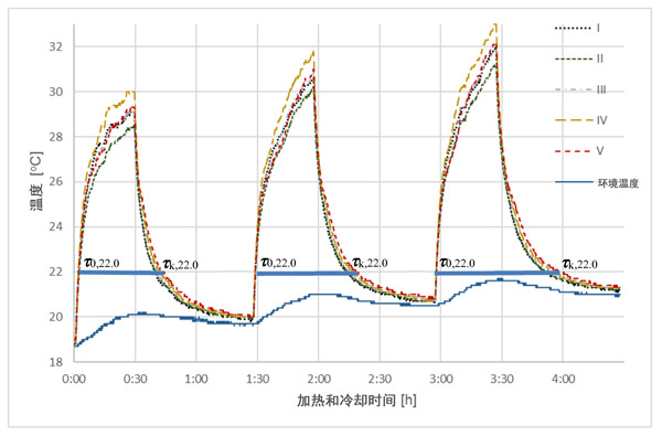 在分析曲線如圖2,圖3和圖4中,并收集結果,在一個溫度(22℃)中選擇,清楚地表明不同相變材料的影響活性炭中的量上的周期時間長度與發生個體樣品中的熱交換過程。相對于溫度傳感器的更高的質量和熱容量,即使吸附的相變材料的量很小,也可以看到處理時間的差異。當與參比樣品(I),沒有相變材料,總的冷卻和加熱時間的所有樣品與相變材料的不同水平長。對于樣品V,此時間延長了7.5%,對于樣品IV,延長了5.2%,對于III,延長了2.4%,對于樣品II(未活化的活性炭),僅延長了0.2%。