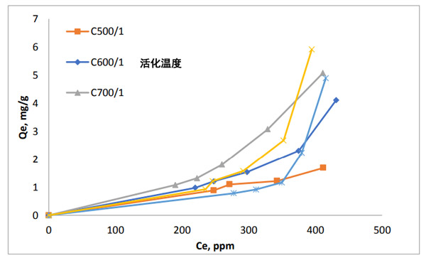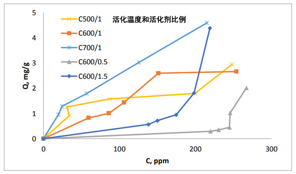 從圖2中可以看出,活性炭在不同的活化溫度(500℃,600℃和700℃)和活化劑比率(0.5、1.0和1.5)下的鋰吸附等溫線。似乎在較低濃度下吸附能力相對較低。這表明鋰離子對活性炭表面的親和力低。高濃度下容量的增加與孔隙率成正相關;钚蕴康妮^大表面積傾向于更多地吸附鋰離子。在等溫線的分類中,該等溫線被認為是III型等溫線,對于無孔或大孔吸附劑來說是典型的。因此,鋰離子似乎不附著在微孔內部,而是附著在外部和大孔表面。活性炭對鋰離子的親和力低。炭表面的碳原子與溶液中的鋰離子之間的低相互作用可能是由于離子的原子質量低所致。原子間勢相互作用表明該力與相互作用原子的原子質量以及原子之間的距離具有正相關。
