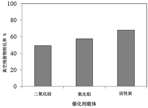 使用原油中的真空殘留物作為原料,在間歇反應器中評估了加氫處理活性。因為所有反應都是在幾乎相同的條件下進行的,所以轉化率的差異主要歸因于所用催化劑的性質。原料的性質包含高瀝青質(22%),硫(5.45%)和其它金屬含量。在圖2中,已經提出了不同催化劑的加氫處理活性,使用活性炭,二氧化硅和氧化鋁為載體的催化劑獲得的加氫脫硫轉化率分別為70%,58%和61%。負載在氧化鋁上的催化劑具有高的加氫脫硫轉化率。