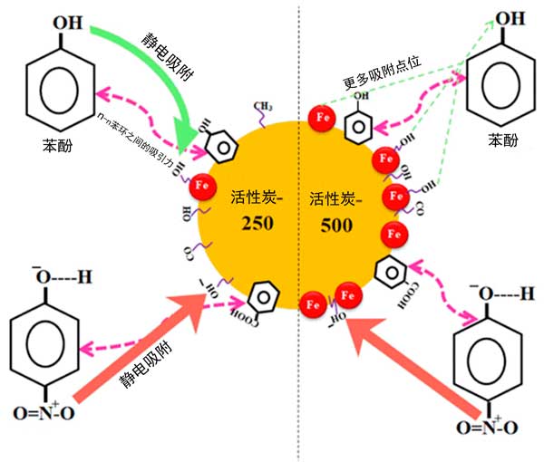 圖1:通過(guò)氫鍵和π-π相互作用將酚類(lèi)吸附到活性炭上的機(jī)理。