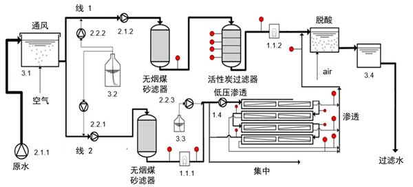 半技術試驗工廠安裝了電氣安裝,工廠控制和數據管理。中試工廠由兩條處理線活性炭和反滲透膜(參見圖1)組成,具有17個采樣點。充氣后的原水通過增壓泵2.1.1和2.1.2從儲水箱(3.1)連續泵出。將痕量有機污染物(3.2)注入標有2.2.1和2.2.2的泵的吸入側,以確保適當的沖洗混合和良好的分散性。加水后的水以平行模式通過無煙煤砂濾池以及隨后的活性炭(線1)和反滲透膜(線2)。每月對粒子過濾器進行反沖洗。為了測試紫外線消毒在反滲透膜之前作為減少生物結垢的附加預處理步驟的效果,在活性炭砂濾池的下游操作了紫外線裝置(1.1.1)。反滲透膜管線的進料通過兩個濾筒過濾器進行預處理,兩個濾筒過濾器依次安裝了80和5μm的標稱截止值。