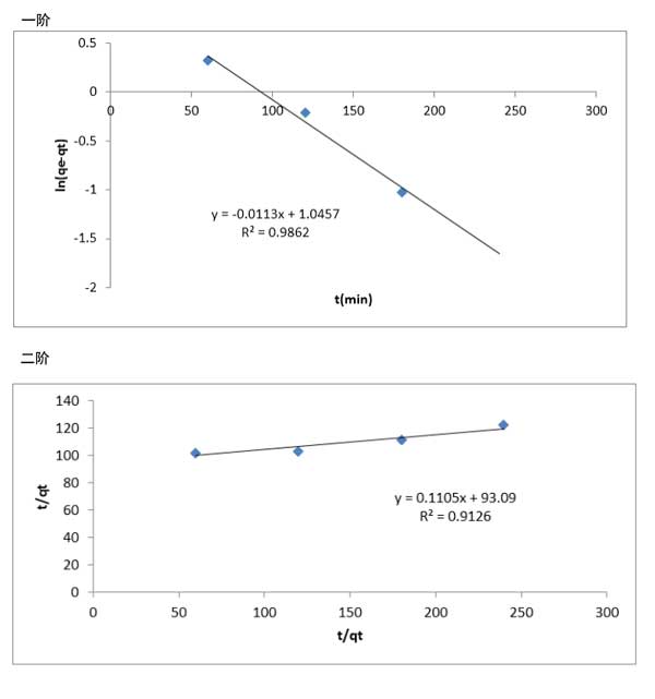 圖3:活性炭吸附柴油脫硫的一階動力學(xué)和二階動力學(xué)。