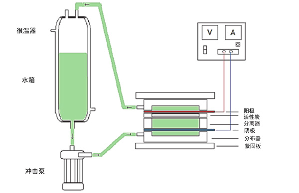 在這項研究中,已開發出用于溴化物電吸附的壓濾電化學電池。為了使電化學電池與受污染的水通過更寬的活性炭床接觸,已經對其進行了修改。在實驗過程中,水通過離心泵在陽極和陰極之間循環,并通過發現為床的活性炭。這樣,可以獲得有關該間歇反應器中吸附動力學以及平衡吸附量的信息。最后的數據對于了解由于施加電勢而可能提高活性炭的吸附容量非常重要。圖1中顯示了電化學電池和用于電吸附過程的設備的示意圖。