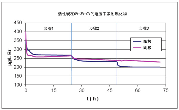 圖4:在三步實驗中的溴化物濃度,第二步對應于在3V下進行24h的陽極和陰極電吸附實驗。在第二步中施加3V電壓24h,然后將其再次置于開路狀態24h。