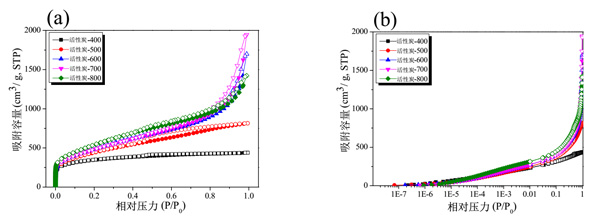 圖1:活性炭的等溫線吸附-解吸曲線隨各種磷酸活化溫度的變化(a)正常和(b)對數。