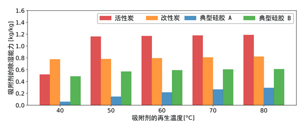 活性炭的除濕能力可以定義為在給定溫度和濕度條件下的有效吸附量,其計算方式為吸附與解吸之間的平衡吸附之差。考慮到實際環境條件,相當于室外空氣條件的吸附條件為干球溫度為32℃,相對濕度為80%。解吸條件是由再生空氣溫度從40℃到80℃給出的,室外空氣條件下的濕度比為24g/kg。計算出的除濕能力如圖1所示。比較了活性炭和典型硅膠(A型和B型硅膠)在不同再生溫度下的除濕能力。在硅膠的情況下,由于缺乏數據,吸附和解吸之間的磁滯被忽略了,并且預期它很小。