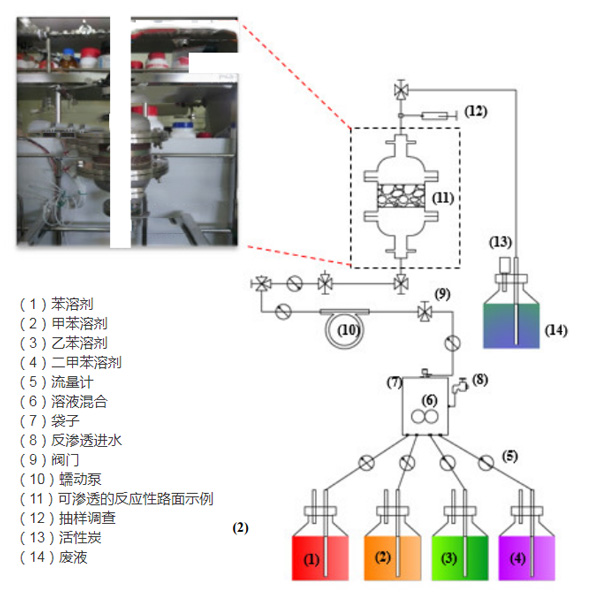 圖1:多孔瀝青路面和可滲透反應性路面-活性炭改性瀝青吸附的實驗裝置。