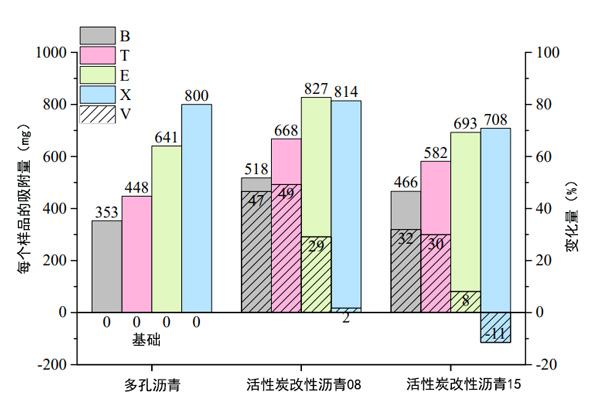 圖3:BTEX吸附在活性炭改性瀝青和多孔瀝青上的質量,并以多孔瀝青為基礎比較吸附變化。