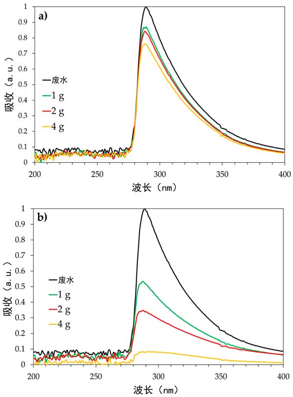 圖3:生物炭樣品(a)和活性炭樣品(b)的洗滌塔廢水的UV-Vis曲線與碳量的關(guān)系。