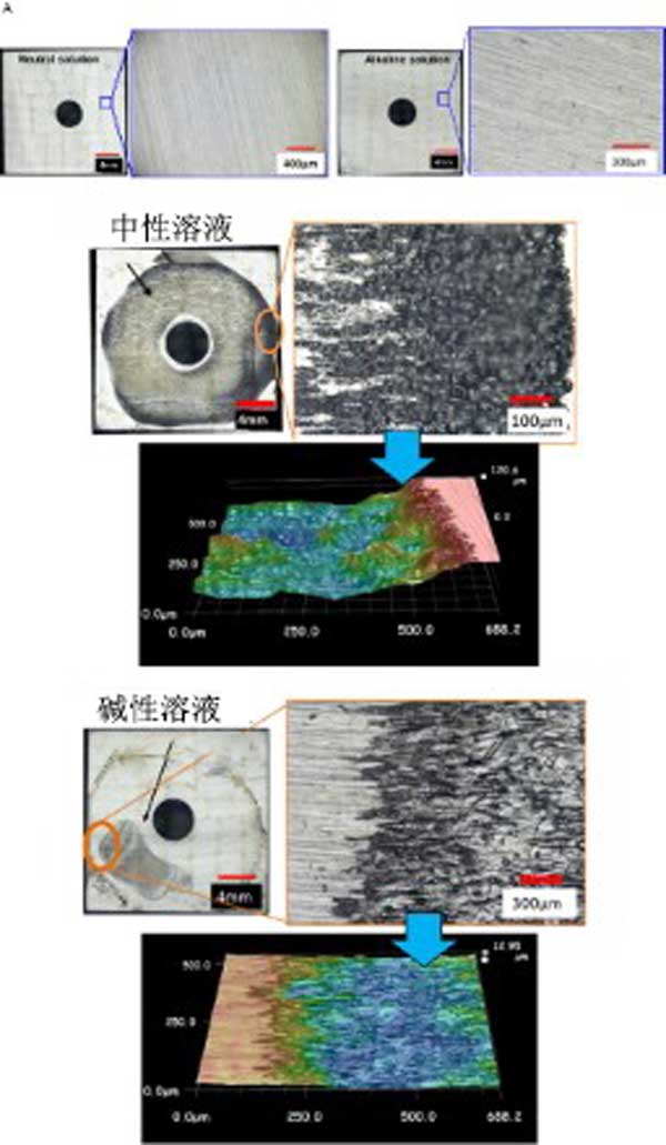 使用光學顯微鏡觀察實驗后樣品的表面形態,如圖3所示。在中性和堿性溶液中未與活性炭接觸的樣品中未觀察到縫隙腐蝕。另一方面,在中性和堿性測試溶液中與活性炭接觸的樣品上發生縫隙腐蝕。這些結果清楚地表明,當樣品與活性炭接觸時,縫隙腐蝕敏感性增加。在中性測試溶液的情況下,最大腐蝕深度為130μm并且縫隙腐蝕傳播以覆蓋樣品的幾乎所有褶皺區域。在堿性測試溶液的情況下,最大腐蝕深度為25μm并且腐蝕區域遠小于中性溶液的情況。這些結果表明,在中性溶液的情況下腐蝕區域和深度更大,這表明在吸附塔中發生實際腐蝕。在堿性溶液的情況下腐蝕面積和深度較小的原因被認為是Fe(OH)2的溶解速率的事實堿性溶液減少,這導致腐蝕速率降低。基本上,在陽極部位的pH降低至去鈍化pH是縫隙腐蝕開始和傳播所必需的?紤]到這個方面,還可以解釋縫隙腐蝕行為的差異。